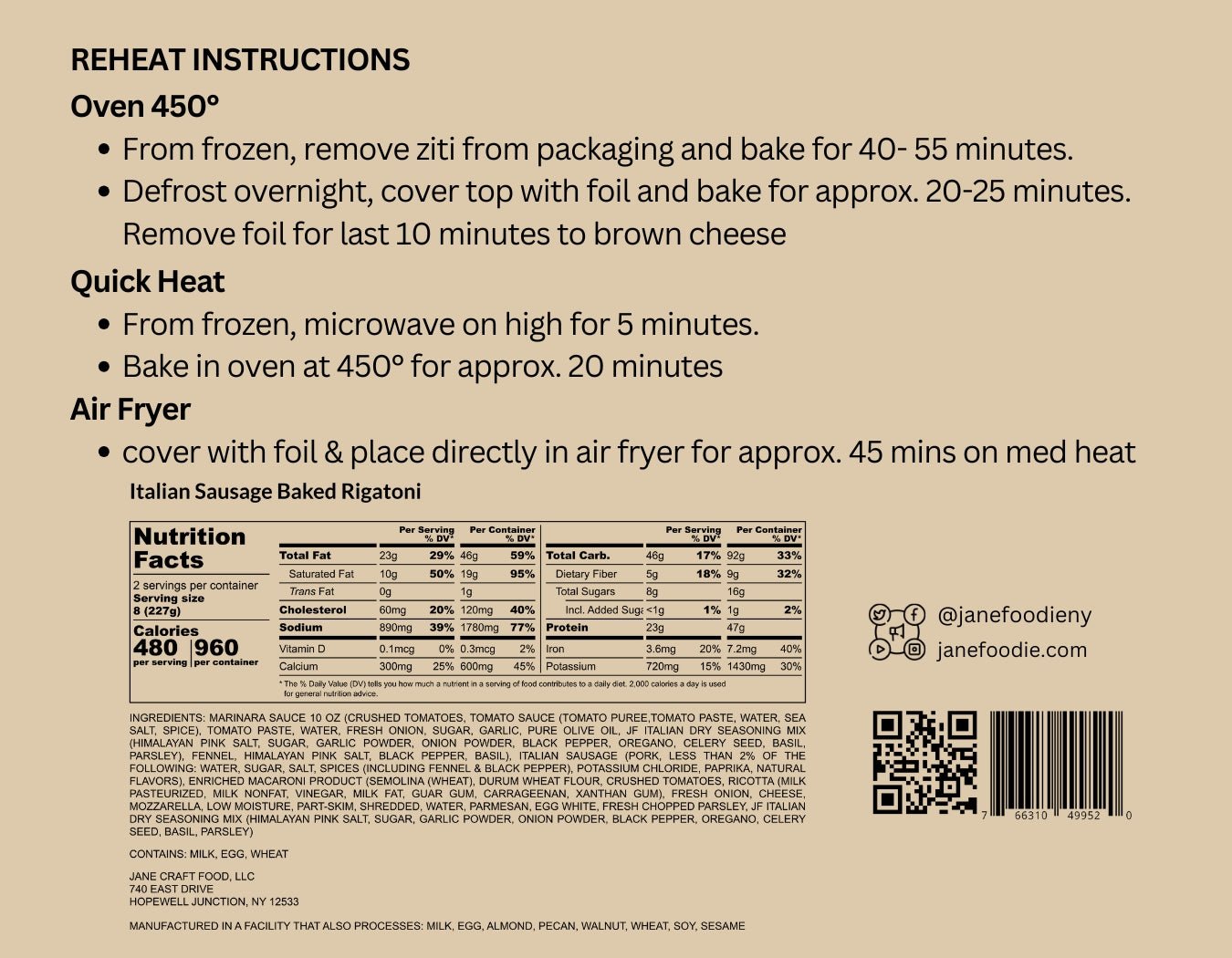 Our Italian Sausage Baked Rigatoni is the ultimate comfort classic—built layer by layer with care. We start with tender rigatoni pasta, add a rich marinara made from vine-ripened tomatoes, and fold in savory Italian sausage and a generous helping of mozzarella cheese. It's flash-frozen at peak freshness to lock in flavor—ready to reheat, serve, and enjoy.