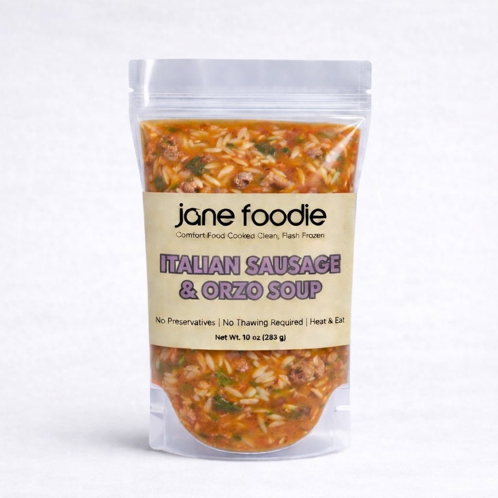 Our Italian Sausage & Orzo Soup features crumbled and browned spicy Italian sausage, orzo pasta, fire-roasted tomatoes, carrots, celery, and baby spinach, all simmered together with Jane’s signature herb medley. This satisfying soup is the perfect warm bowl on a chilly day, with just the right amount of kick. Made with all natural ingredients and then flash frozen, you can enjoy this home-cooked meal in minutes - just heat and eat! 10 oz single serving.