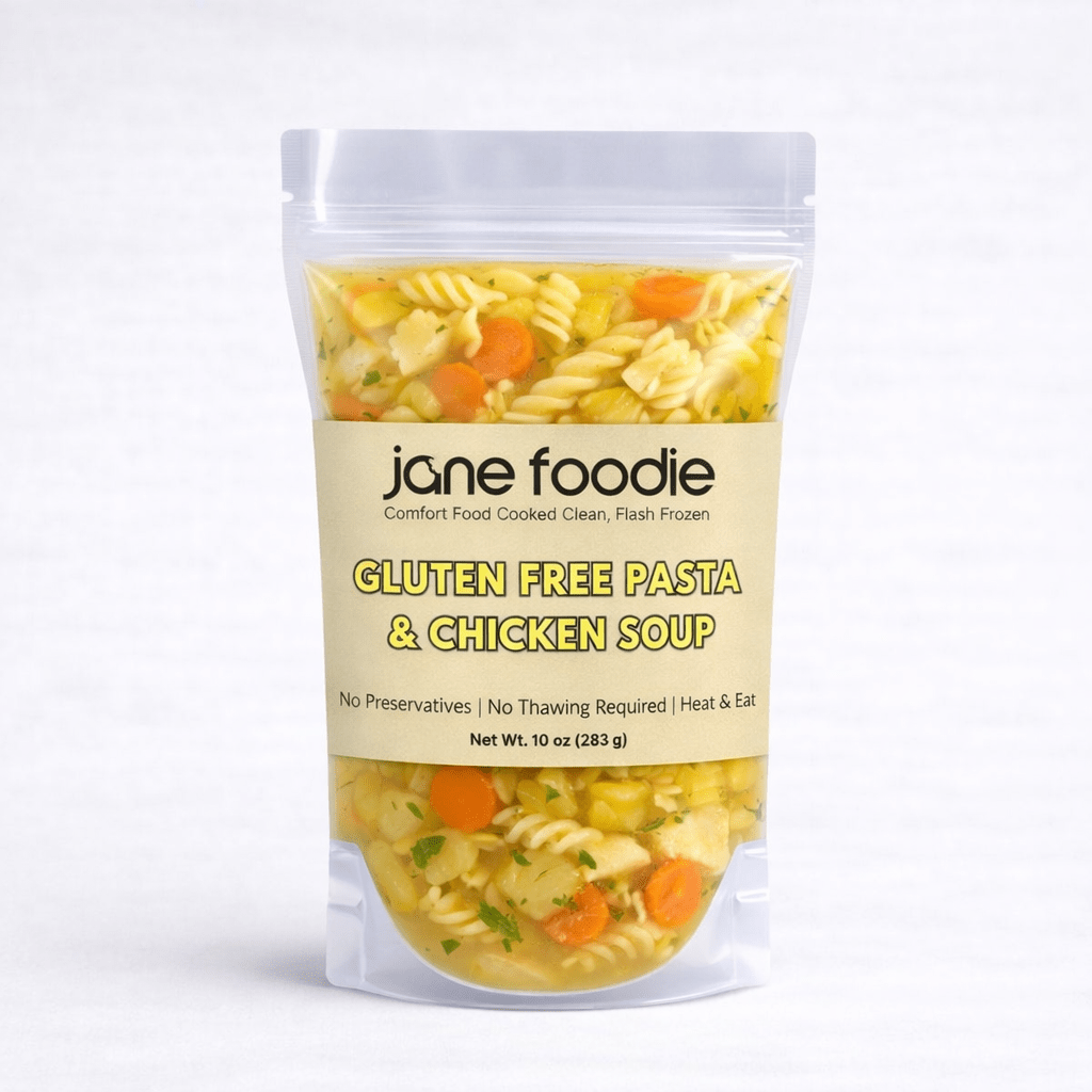 Our Chicken & Gluten-Free Pasta Soup is a nourishing comfort food, brimming with tender chicken, gluten free pasta, and a medley of celery, carrots, and onion. Each ingredient contributes to a symphony of flavors that are gently simmered in a rich low-sodium chicken stock, seasoned with parsley, thyme, Himalayan pink salt, and black pepper. This soup offers a fresh spin on a wholesome classic, flash frozen for you to enjoy a bowl in minutes. 10oz single serving.
